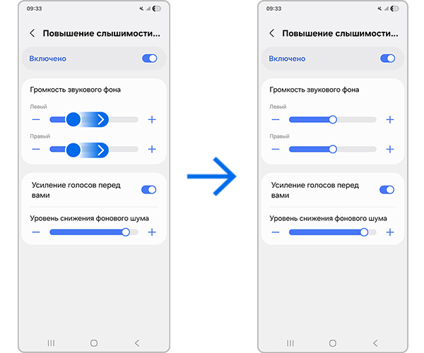 [С функцией «Усиление голосов перед вами» вы сможете четче слышать голос людей вокруг, а уровень остального шума будет снижен. Чтобы включить эту функцию, нажмите на бегунок.]