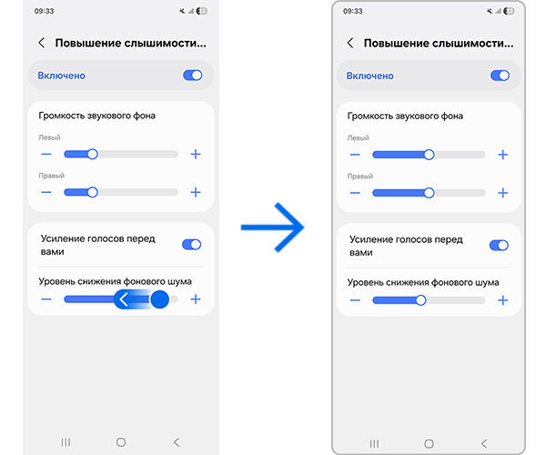 [Вы будете слышать лучше слышать голоса рядом. Уровень остального фонового шума будет снижен. Чтобы отрегулировать уровень остального шума, потяните за бегунок вправо (чтобы снизить уровень фонового шума) или влево (чтобы повысить уровень).]