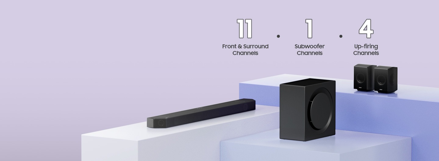 [مثلما رأينا في نسق الـ 11.1.4 قناة، تحتوي العديد من أجهزة الصوت sóúñ~dbár~ على رقم ثالث. تلك القنوات تُستخدم لخلق تجارب صوتية غامرة عن طريق إضافة ارتفاع للصوت لتشعر بأن الصوت يأتي من فوقك. وتلك التأثيرات هي الأكثر تأثيراً في تجربة الصوت المحيطي الافتراضية.]