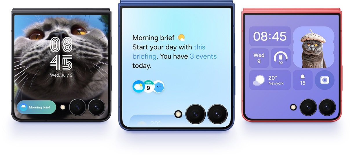 يمكنك الآن إضافة عناصر واجهة مستخدم مختصرة إلى شاشة الغطاء مثلما تفعل على شاشة القفل. وقد أصبحت عناصر واجهة المستخدم المختصرة أصغر حجماً وتوفِّر وصولاً سريعاً إلى المعلومات والميزات المفيدة من دون أن تشغَل مساحة كبيرة. (متوفّرة فقط على بعض أجهزة الفئة G~áláx~ý Z Fl~íp).