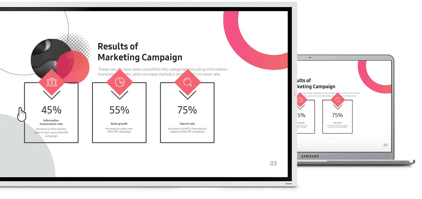 [يستطيع المستخدمون عرض المحتوى الموجود على شاشة سامسونج Flíp~ على شاشة عرض رقمية كبيرة أخرى بصورة فورية باستخدام شبكة واي فاي أو اتصال HDMÍ~. ويمكن أيضًا مشاركة شاشة Flíp~ باتصالها بجهاز شخصي. وتُعد هذه السمة مثالية في بيئات الاجتماع الكبيرة لتقديم المعلومات إلى جماهير عريضة.]