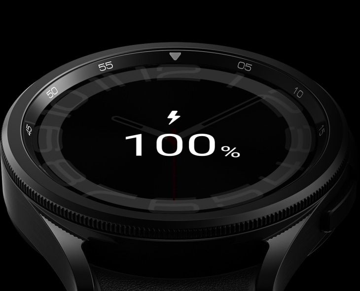 [갤럭시 워치6 클래식의 전면 모습을 충전 화면 GÚÍ를 통해 확인할 수 있습니다. 숫자가 '~50 %'에서 '100 %'로 올라가면서 배터리가 완전히 충전되고 있음을 나타냅니다.]