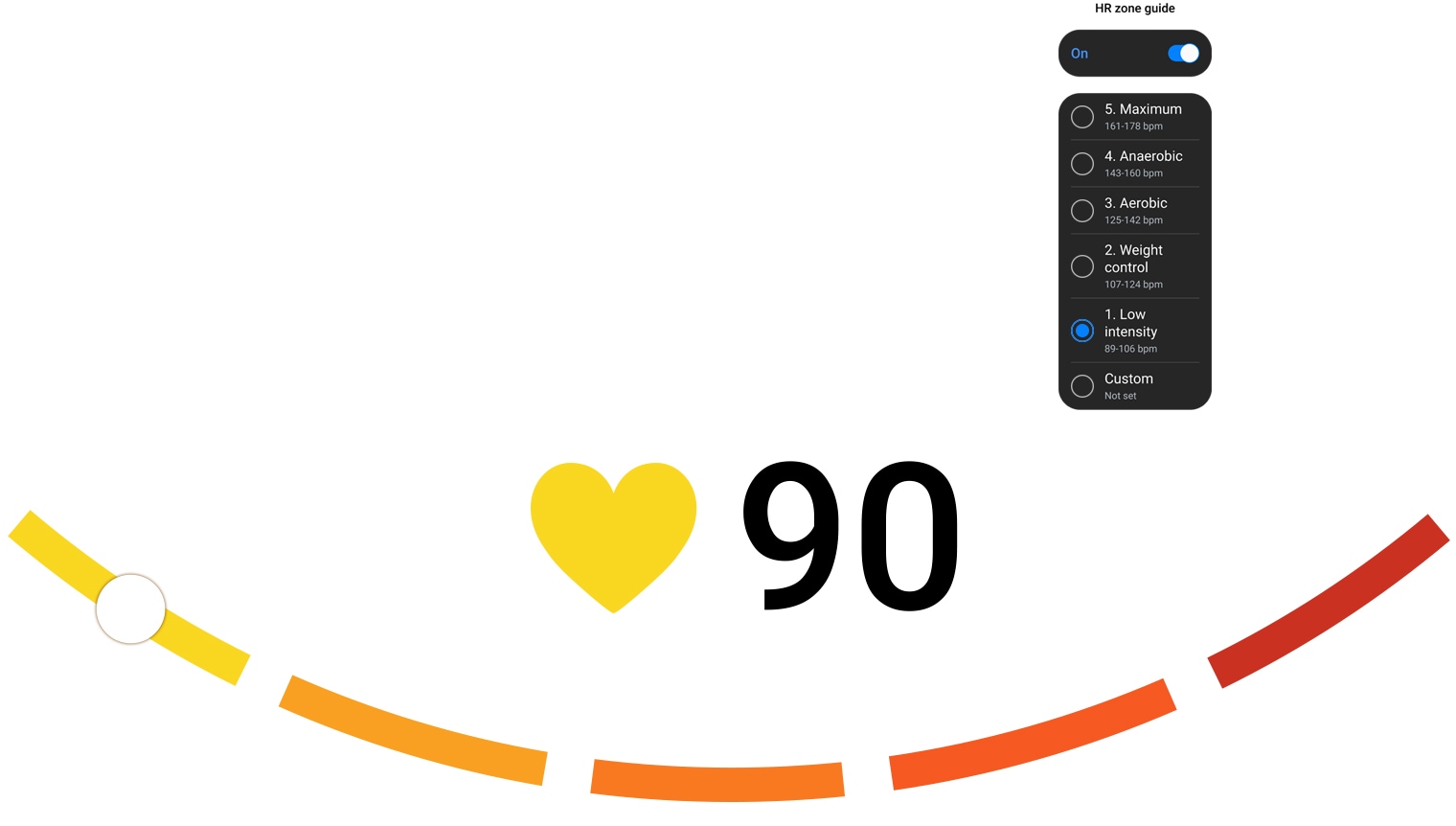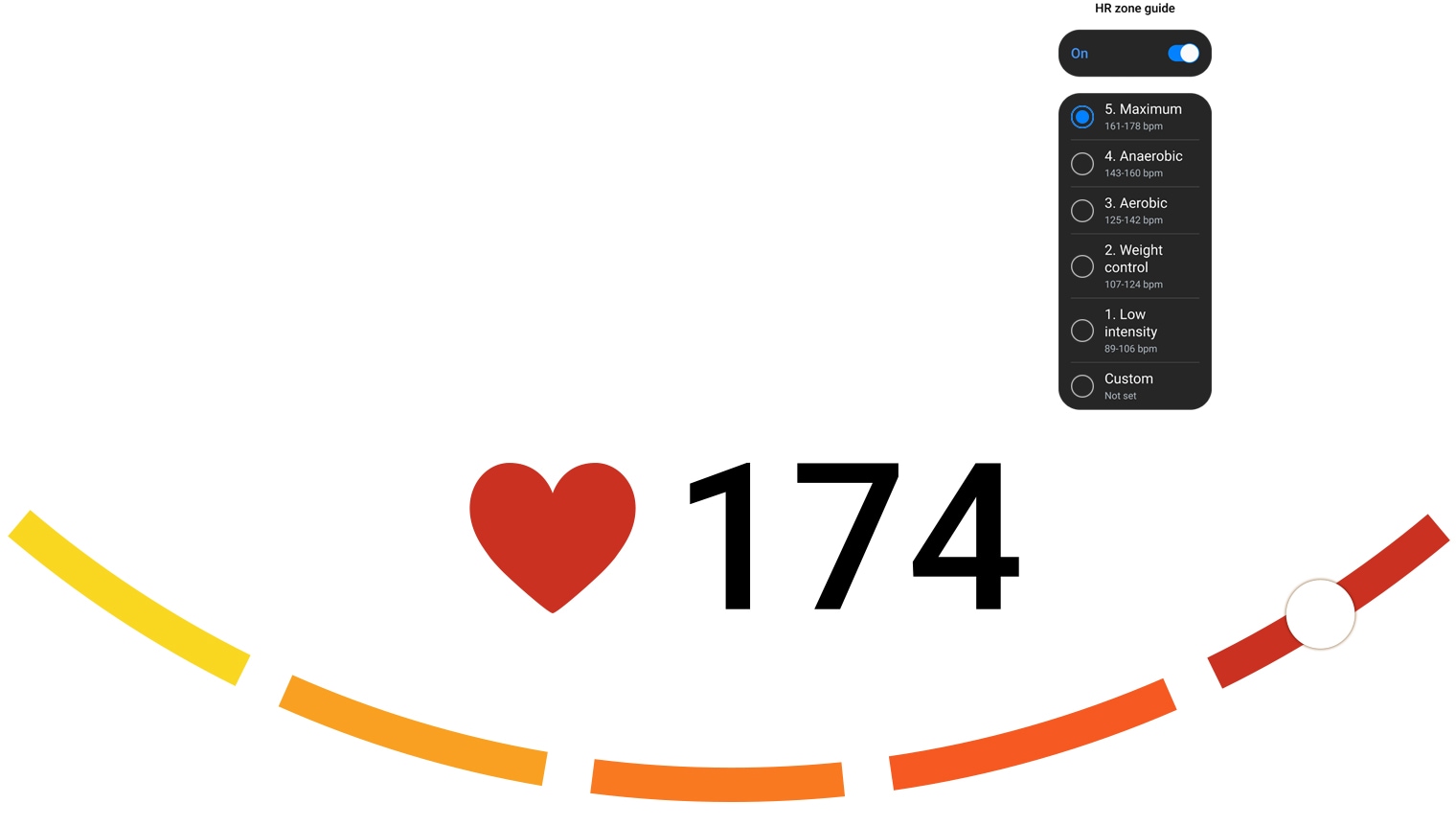 [Ú자 모양을 이루는 5개의 서로 다른 곡선이 있습니다. 각각 노란색에서 주황색을 넘어 빨간색까지 단계별로 점점 짙어집니다. 각 선의 중간에 위치한 흰색 점은 개인 맞춤형 심박수 구간이 변경되었음을 나타내는 동일한 색상의 심장 및 심박수 숫자이며, 선을 따라 이동합니다. 기능 버튼이 활성화되고 5개의 심박수 구간이 있는 개인 맞춤형 심박수 구간의 GÚÍ~가 표시됩니다. 심박수가 90에서 114, 125, 158 및 174로 증가함에 따라 선택한 영역이 각각 1에서 5로 변경됩니다.]