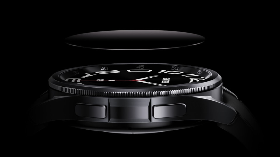 [갤럭시 워치6 클래식이 사파이어 크리스탈 글라스의 내구성을 설명하기 위해 화면을 비추는 빛과 함께 회전합니다.]