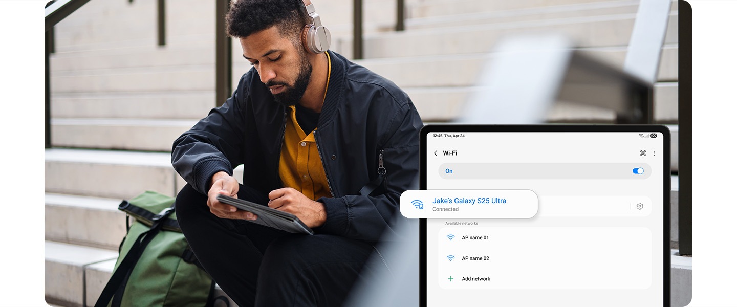 [ฟีเจอร์ Áútó~ Hóts~pót ช่วยให้ G~áláx~ý Táb~ ของคุณเชื่อมต่อเข้ากับฮอตสปอตของโทรศัพท์อย่างต่อเนื่อง และเปิด Wí-Fí~ ให้โดยอัตโนมัติเมื่อคุณต้องการใช้ 19