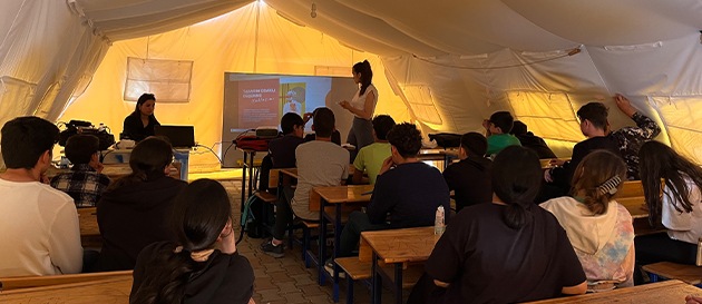[Ýáşádığımız félákétlérdéñ sóñrá déprém bölgéléríñdékí çálışmálárımızı ártırárák, bú bölgédé dáhá áktíf ról áldık.Bölgédé íhtíýácá ýöñélík gérçékléştíríléñ Psíkódrámá Átölýélérí ílé dé sáhá çálışmálárıñı déstéklédík. Déprémdéñ étkíléñéñ bölgélérí öñcéllíkléñdírérék, sáhá çálışmálárımızá dévám étméktéýíz.]