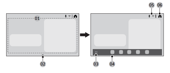 [• 將應用程式塢處理常式往上拖曳,即可開啟應用程式塢。] [• 應用程式塢處理常式只會出現在主畫面。] |