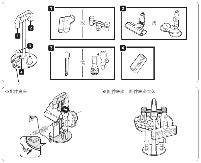[● 將配件拆卸並存放時,灰塵可能會從無線吸塵器的吸入配件中掉落。]