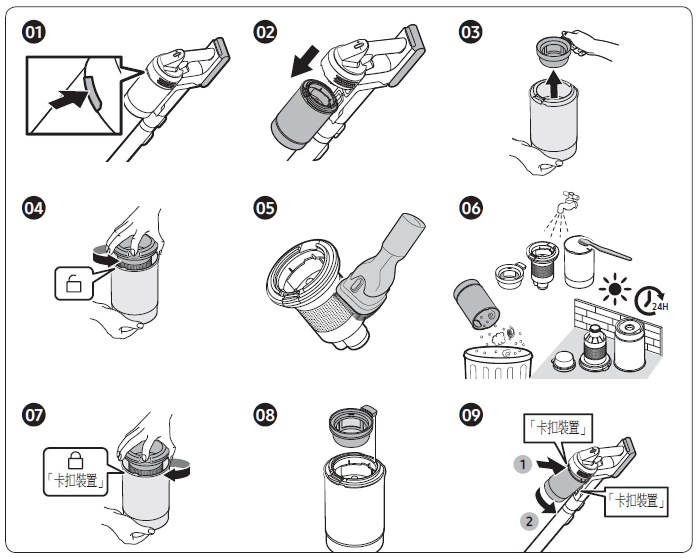 - [用水清洗集塵筒/可水洗極細濾網後,應將其置於陰涼處 24 小時以上徹底晾乾方再進行使用。