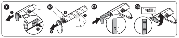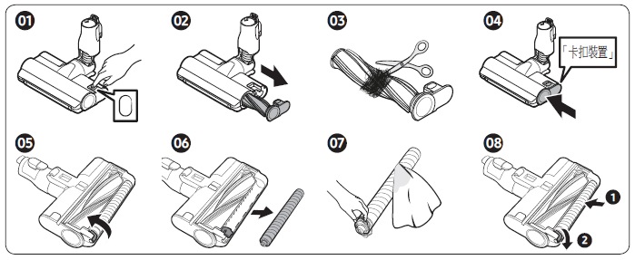 - [如果布或其他異物被無線吸塵器吸入,並被旋轉毛刷 (滾筒) 纏繞,旋轉毛刷將停止工作以保護毛刷電機。清潔毛刷後,關閉電源,然後再重新開啟。]
