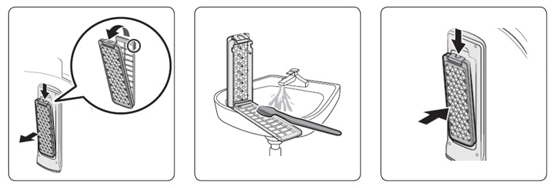 [打開蓋子,以自來水和刷子清潔濾網。]