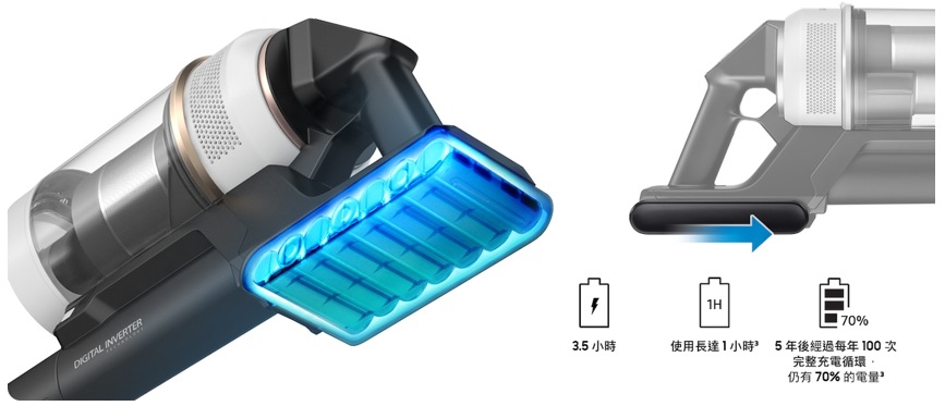 [同時兼具長效續航性能,達到單顆電池可使用 60 分鐘² ,兩顆電池就能連續使用 120 分鐘³ ,讓清潔不中斷。]