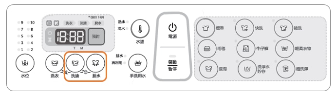 [若要啟動兒童鎖時,請同時按住洗清和脫水 3 秒鐘。指示燈隨即閃爍。]