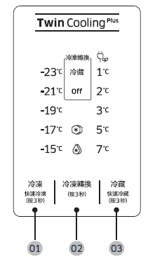 - [如果在 冷凍模式時按住 冷凍轉換按鈕保持 3 秒,冰箱切換到 冷藏模式,然後您可以選擇一個模式(選擇模式)。]