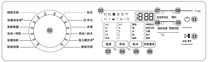 [按下以增加烘乾選項。] [• 時間設定:用於在指定的時間內烘乾洗滌的衣物。] [• 輕柔衣物:用來烘乾熱敏衣物。這可以低溫烘乾以保護衣物的纖維。] [• 少量:用於快速烘乾少量衣物。(20 分鐘內)] [• 強力:用來烘乾牛仔褲和毛巾等厚重衣物。] [• 標準:用來烘乾如棉質、內衣和麻料等衣物。] |