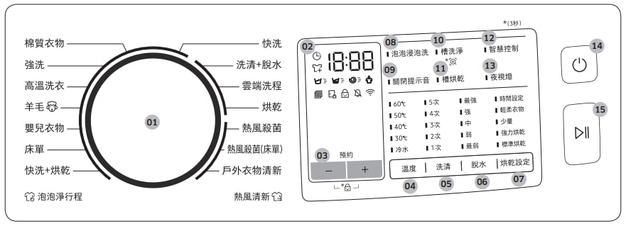 [01. 洗程選擇器:轉動旋鈕選擇一個洗程。]