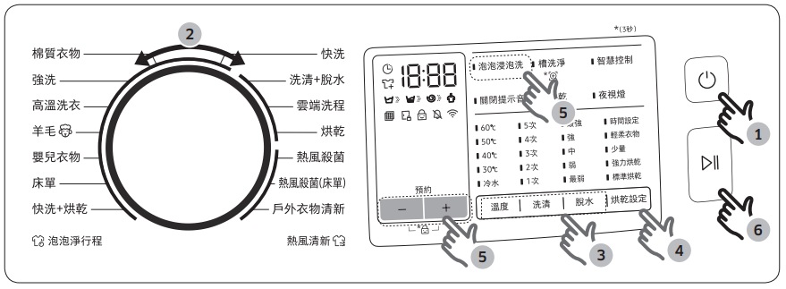 [5. 洗衣機支援預約和泡泡浸泡洗選項以方便操作。若要使用選項,請按相應按鈕。]