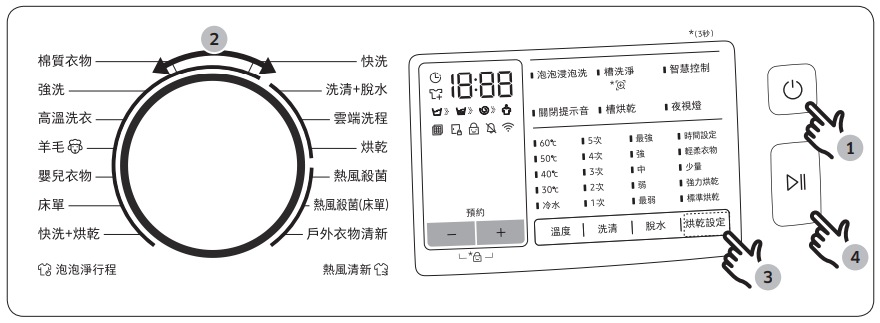 [3. 重複按烘乾設定直到設定到所要的烘乾選項。]