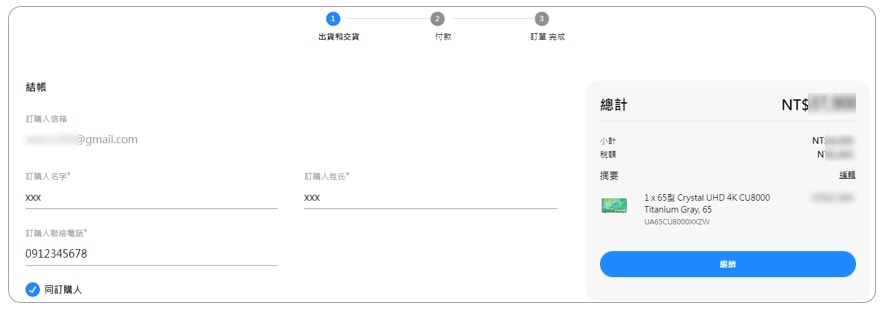 [點選左下角「繼續結帳」後,輸入您的付款資訊,最後再依螢幕上提示完成結帳。]