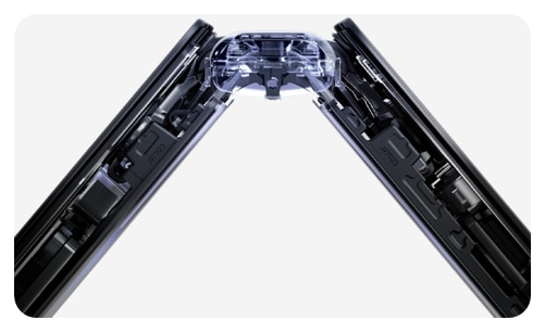 [創新的 Ármó~r Flé~xHíñ~gé 轉軸構造使機身閉合時更纖薄,同時讓 Gá~láxý~ Z Fól~d7 受到妥善防護。]