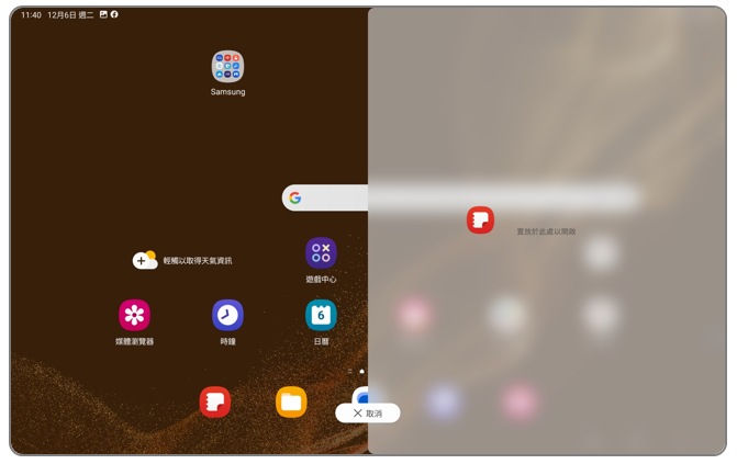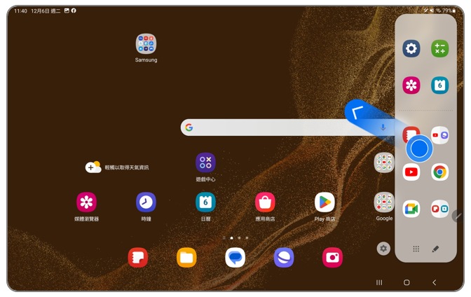 [Gálá~xý Tá~b S8 升級至 Áñ~dróí~d 13(Óñé~ ÚÍ 5) 後,您可以透過側螢幕面板將應用程式拖移至螢幕中來開啟。]