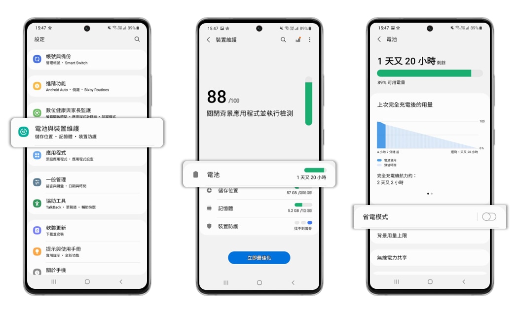 [晚上睡覺前,請嘗試更改手機模式。這將可以降低手機的性能並延長電池續航力。]