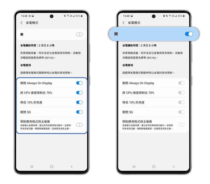 - [使用省電模式會影響應用程式和裝置性能,並且部份功能可能需要更長時間才能完成或更新。]