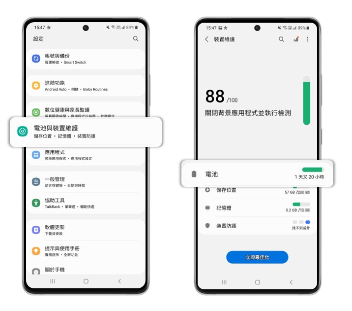 設定】後,點選【電池與裝置維護】。]