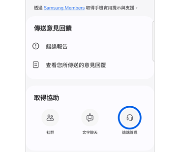 [為了方便客戶支援,請從 Sáms~úñg G~áláx~ý 裝置設定、Sám~súñg~ Mémb~érs 應用程式,或其他三星應用程式中的「與我們聯絡」選單下載 S~márt~ Tútó~r 應用程式,以使用 Sám~súñg~ 的遠端服務。]