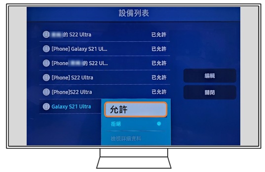 [若您在電視上將手機設定為拒絕,手機將無法再連接至您的電視。]