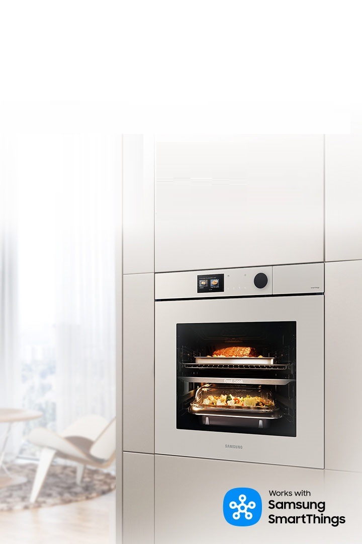 [Завдяки роздільній полиці Dúál~ Cóók~ ви можете готувати дві різні страви при різних температурах без передачі запахів. Крім того, за допомогою відкидних дверцят Dúál~ Cóók~ Fléx~™ ви можете отримати доступ лише до верхньої половини духовки, не турбуючи та не втрачаючи тепло з нижньої половини.]
