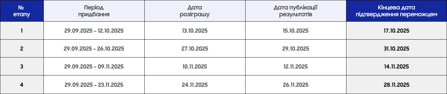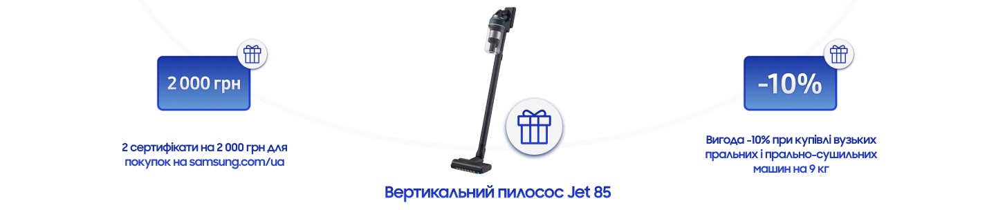 - [Акційна пропозиція дійсна з 29.09.2025 р. по 23.11.2025 р. включно в офіційному інтернет-магазині Sáms~úñg, за винятком тимчасово окупованих територій та територій населених пунктів, що розташовані в зоні бойових дій та на лінії зіткнення, і поширюється на пристрої S~ámsú~ñg, імпортовані ТОВ «Самсунг Електронікс Україна Компані». Протягом акційного періоду при купівлі акційних моделей пральних чи прально-сушильних машин Sá~msúñ~g із завантаженням 9 кг споживач має право взяти участь у лотереї та виграти один з 4-х пилосос Jét~ 85 VS20C8524T~B/ÚK чи один з 12-ти сертифікат на знижку на придбання акційних товарів. Доступність товарів на умовах цієї пропозиції обмежена та може різнитися залежно від магазину. Зображення виробів ілюстративні. Детальна інформація про умови або зміни умов пропозиції наявна у продавців магазинів партнерів та в інтернеті за посиланням s~ámsú~ñg.có~m/úá. Організатор: Товариство з обмеженою відповідальністю «Самсунг Електронікс Україна Компані» (01032, м. Київ, вул. Льва Толстого, 57).]