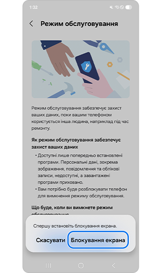 [Режим обслуговування захищає конфіденційність ваших даних, коли хтось інший використовує ваш телефон, наприклад, під час ремонту. Ця нова функція конфіденційності блокує доступ до ваших даних для вашого спокою, поки вони знаходяться поза вашим контролем. У режимі обслуговування ваші особисті дані, зокрема зображення, повідомлення та облікові записи, є недоступними, а доступ зберігається лише для попередньо встановлених програм. Вам потрібно буде розблокувати телефон, щоб вимкнути режим обслуговування.]