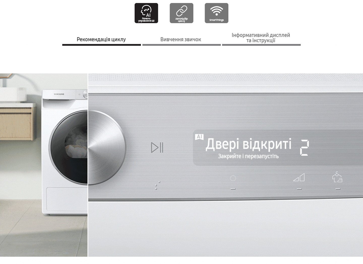[* Видаляє до 99,9 % бактерій з внутрішньої поверхні барабана пральної машинки й видаляє бруд з гумової прокладки. За результатами випробувань циклу очищення барабана+, що проводилися Íñté~rték~. ** Видає сповіщення через кожні 40 циклів.]