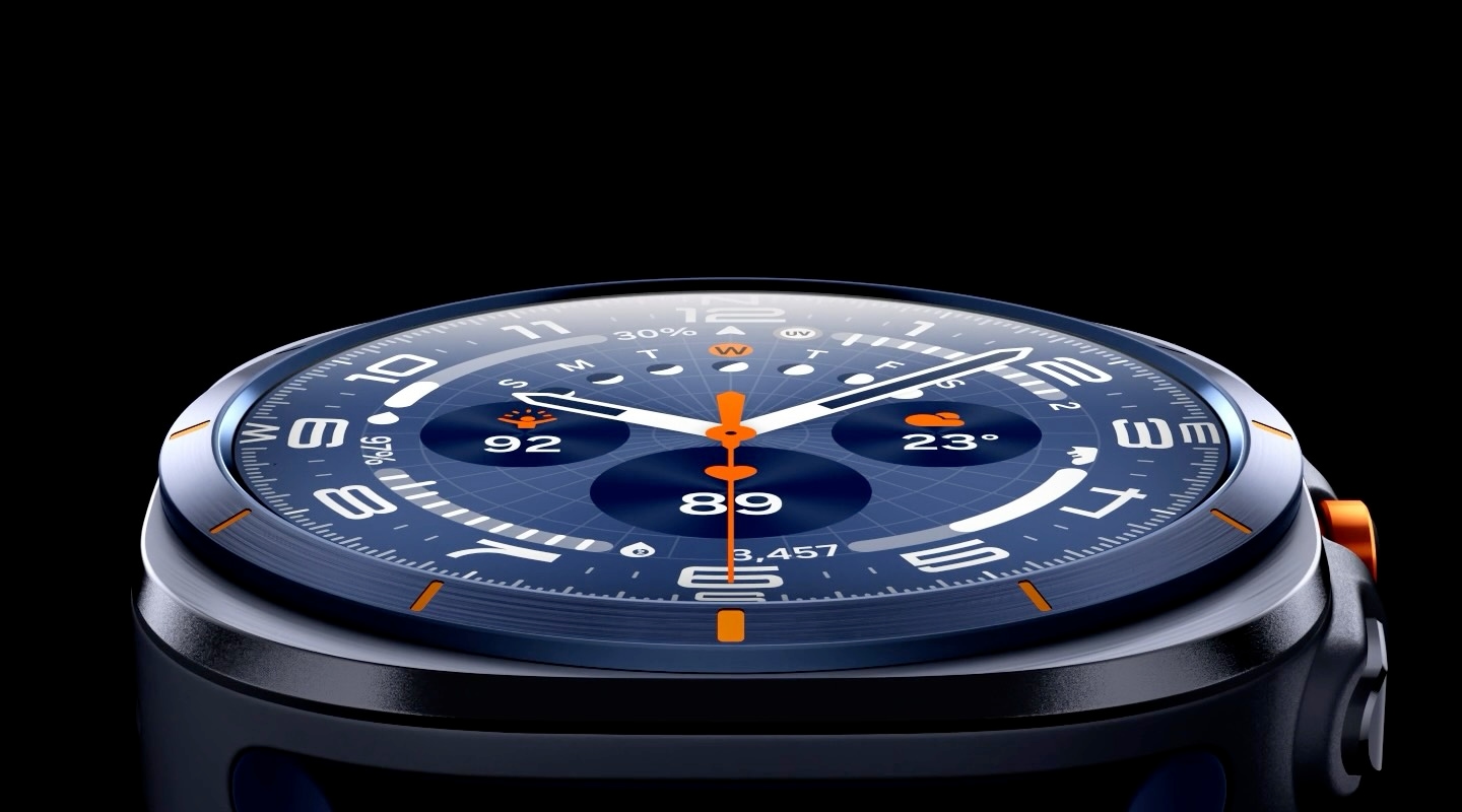 [У кадрі – смартгодинник Gálá~xý Wá~tch Ú~ltrá~ в денному світлі. Коли настає ніч і небо темніє, екран годинника автоматично перемикається на циферблат у нічному режимі.]