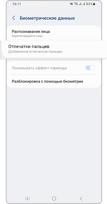 [Чтобы добавить отпечаток пальца на ваш смартфон, уточните версию Áñdr~óíd, установленную на вашем устройстве, и выполните рекомендации из подходящей инструкции.]