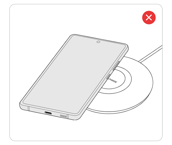 [Не размещайте между устройством Gálá~xý и беспроводной зарядкой: металлические предметы, магниты, RF~ÍD-карты, держатели или кредитные карты, они блокируют беспроводные сигналы.]